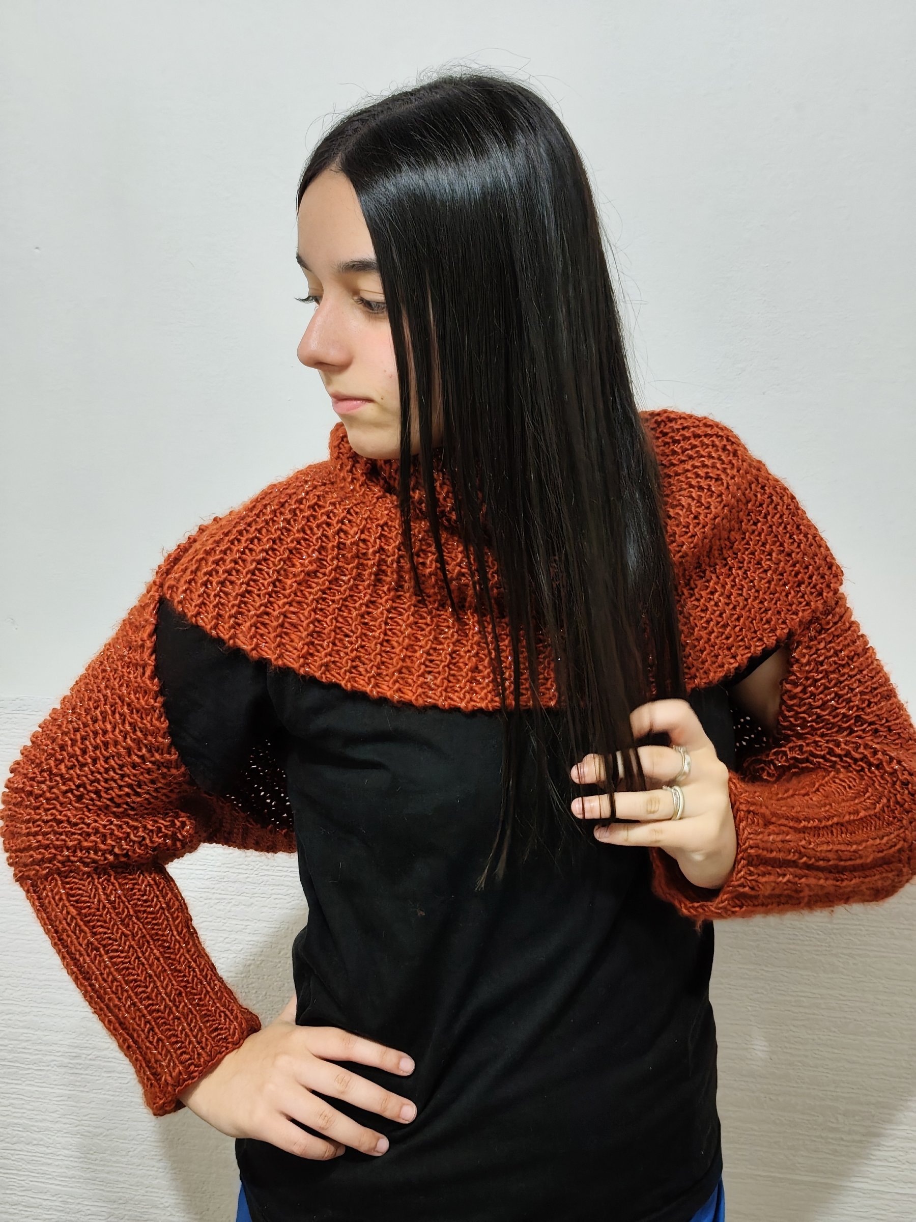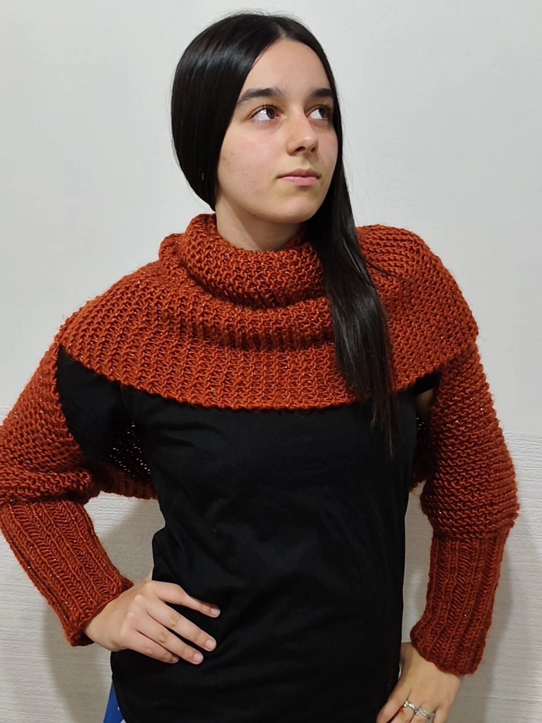 Bufanda con mangas tejida en lana acrílica color terracota con detalles de lurex plateado.